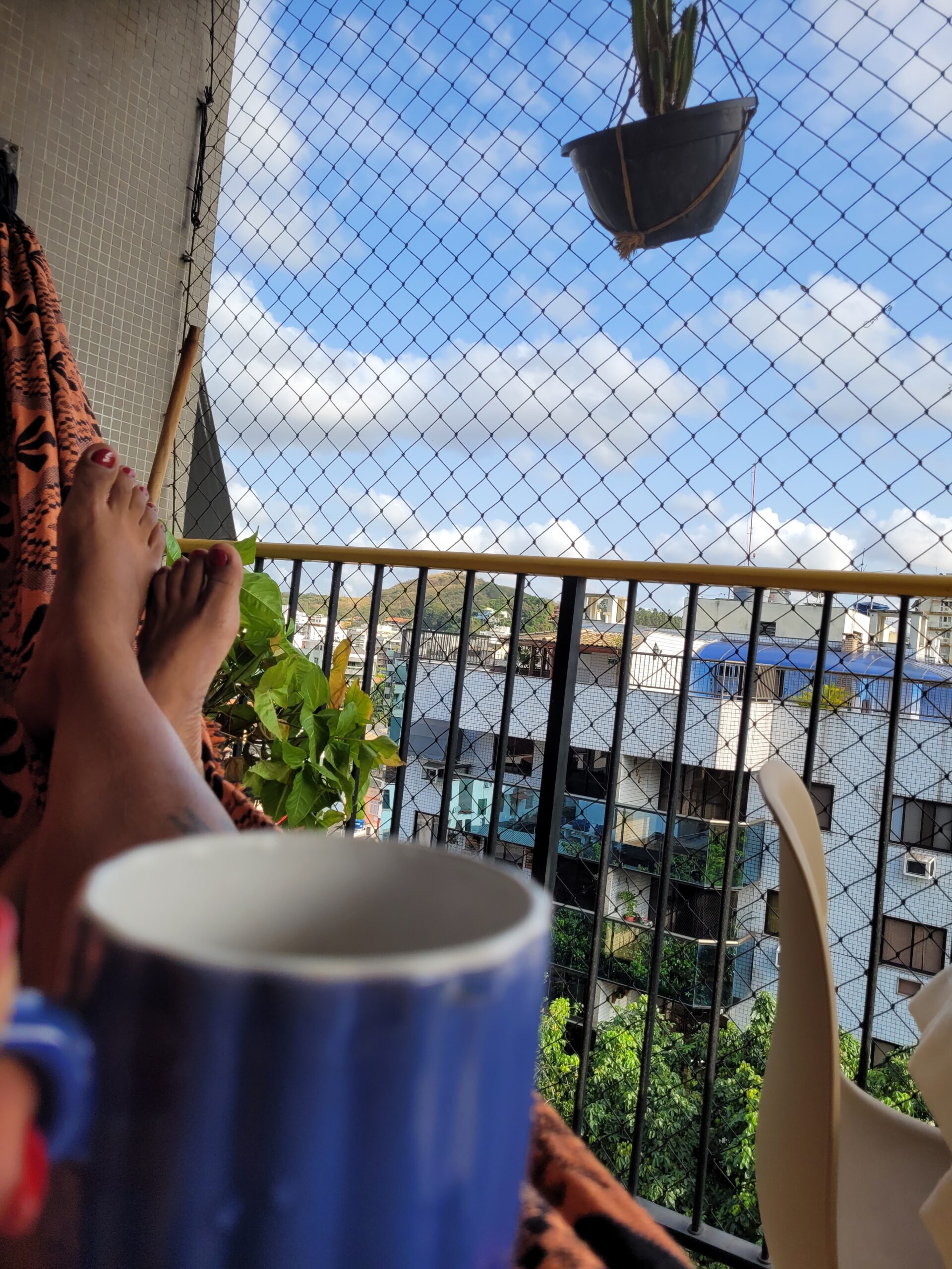 Amiga, olha essa cena comigo…O céu está limpo, a brisa quase não mexe nas folhas da planta, e o gato parece contemplar tudo com aquela …