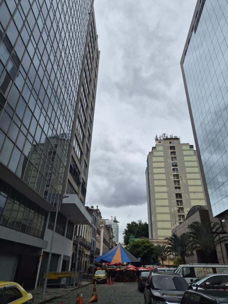 Entre prédios antigos e arranha-céus envidraçados, cada construção com sua estética própria, sua linguagem arquitetônica, sua época. O clássico dialogando com o contemporâneo. Pedra, vidro, ferro, concreto. Tudo coexistindo.