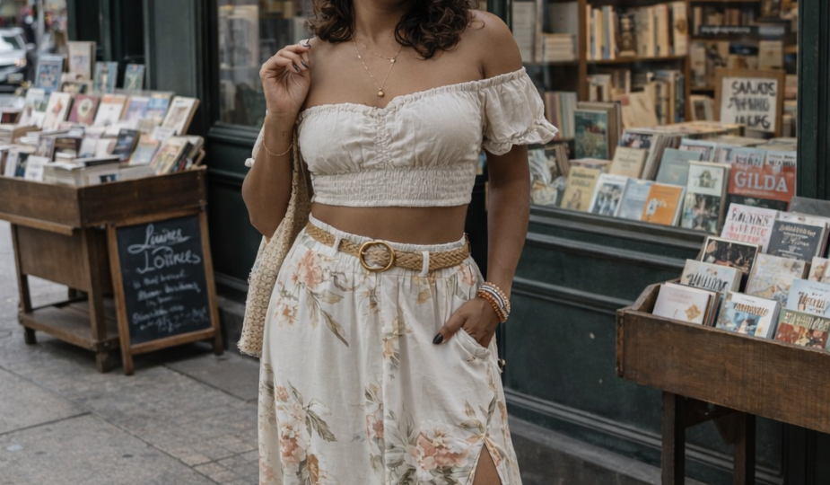 O look que compartilhei recentemente, com decote ombro a ombro e saia midi fluida floral, é um excelente exemplo disso. Não porque seja “bonito” (isso é o mínimo), mas porque ele diz algo. E diz com clareza.