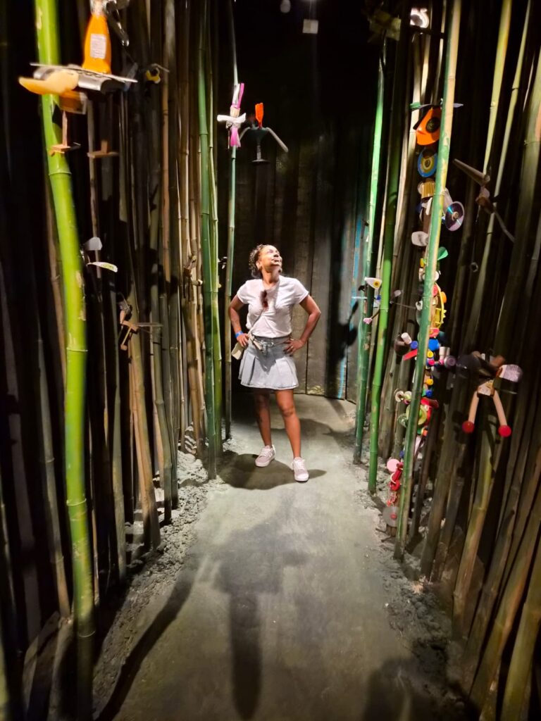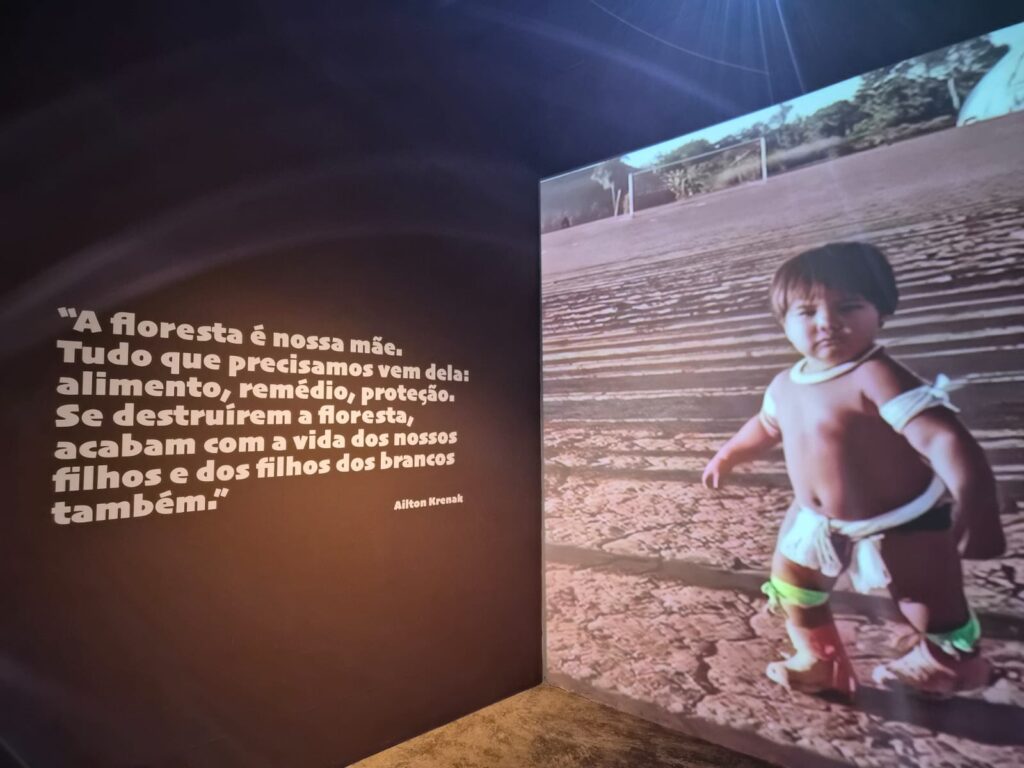 Logo na entrada, a experiência já começa de forma impactante, com uma cena que remete a uma queimada, um convite imediato à reflexão sobre a relação entre natureza e humanidade.