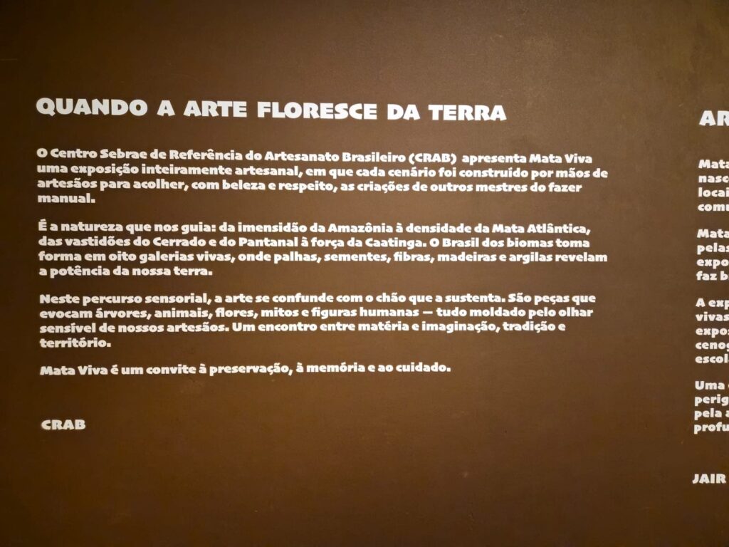 A exposição é um verdadeiro mergulho sensorial na diversidade natural e cultural do Brasil. São mais de 260 peças criadas por 65 artesãos de várias regiões do país, produzidas a partir de materiais dos nossos biomas, da Amazônia à Mata Atlântica, passando pelo Cerrado, Pantanal, Caatinga e Pampa.